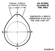 Inspect the camshaft lobes for scoring and signs of abnormal wear. Lobe pitting except in the general area of the lobe toe is not detrimental to the operation of the camshaft; therefore, the camshaft should not be replaced unless the lobe lift loss has exceeded specification or pitting has occurred in the lobe lift area.