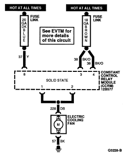 The cooling fan is controlled during vehicle operation by the constant control relay module (CCRM) and powertrain control module (PCM) 12A650 which energizes the cooling fan under the following conditions: