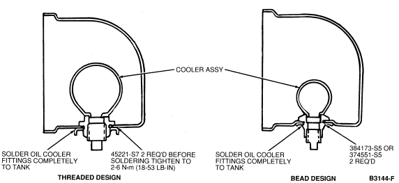 Oil Cooler: Install the replacement oil cooler assembly into the tank openings and secure cooler with new retaining rings. For threaded design, tighten retainer to 2-6 Nm (18-53 lb-in). For bead design, push ring past fitting bead. Retaining ring tangs should point away from tank.
