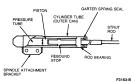 In addition to allowing for the wheels up and down movement, the shock strut is part of the axis that is needed for wheel turning. The spindle attachment bracket and outer can assembly is allowed to rotate relative to the shock strut's piston rod. The rotating movement of the shock strut must be free from binding, sticking and friction conditions to ease the vehicle's steering effort. To reduce friction, a garter spring seal surrounding the piston rod shaft and a low-friction bearing surface between the strut's piston and pressure tube has been provided.