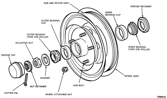 Each front wheel is bolted to the hub and rotor assembly. There are two opposed, tapered roller bearings and a grease retainer installed in the hub. The grease retainer prevents grease leakage onto the rotor.