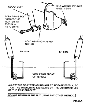 With 5.0L Engine: lace the absorber's lower mounting eye between the ears of the lower shock mounting bracket, then insert the bolt. Its bolt head must seat on the inboard side of the shock bracket, through the shock bracket and the shock absorber mounting eye. Install a new nut. Do not tighten the nut at this time.