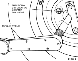 Raise up one rear wheel and remove the wheelcover. Install adapter for Traction-Lok Differential T59L-4204-A or Torque Tool T66L-4204-A on the axle shaft flange studs.