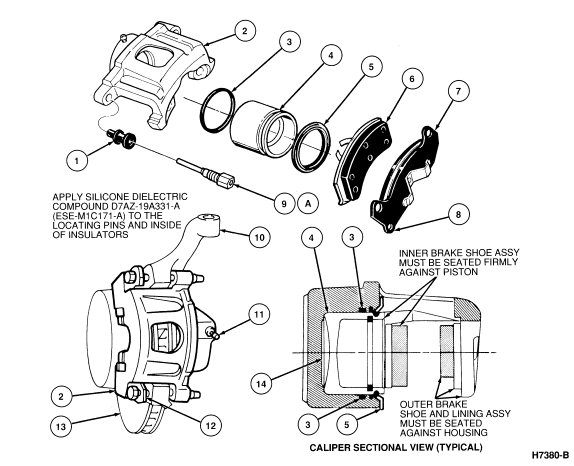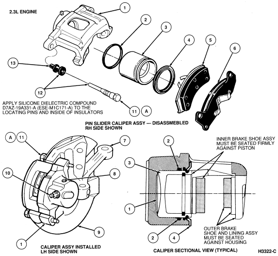 The caliper assembly consists of a pin slider-type caliper housing, inner and outer shoe and lining assemblies, and a single piston. The caliper assembly slides on two locating pins which also act as the retaining bolts between the caliper and the combination anchor plate and spindle.