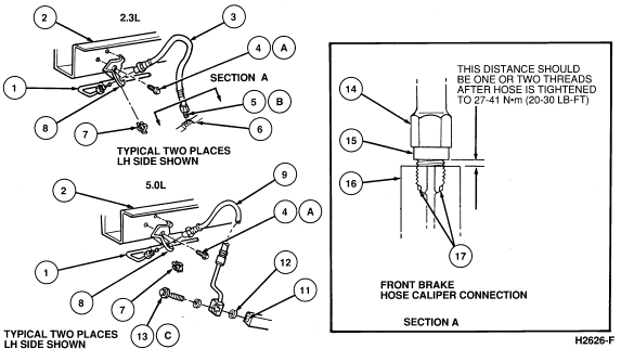 On Mustang 5.0L, install the flexible brake hose to the caliper, use a hollow bolt and two new sealing washers. Tighten hose fitting to 40-60 Nm (26-44 lb-ft).