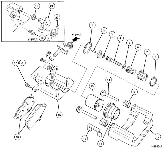 Except for the parking brake mechanism, the rear caliper assembly is basically similar to the pin slider front brake caliper. The added parking brake lever on the back of the caliper is cable-operated by the parking brake pedal located below the instrument panel, similar to rear drum brake installations. The parking brake is self-adjusting.