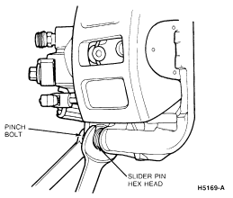 - Hold slider pin hex-heads with open-end wrench and remove pinch bolts.