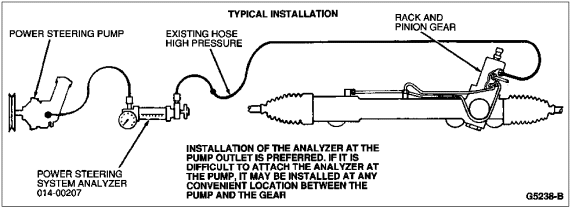 The test procedure used in conjunction with the Rotunda Power Steering System Analyzer or equivalent provides a method for checking the complete power steering system. The analyzer can be used on integral or non-integral power steering systems to determine the cause of hard steering and/or lack of assist concerns.
