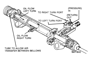 When the steering wheel is turned, resistance of the wheels and the weight of the vehicle cause a torsion bar to deflect. This deflection changes the position of the valve spool and sleeve ports, directing fluid under pressure to the appropriate end of the power cylinder. The difference in pressure forces on the piston helps move the rack to assist turning effort. The piston is attached directly to the rack, and the housing functions as the power cylinder. The oil in the opposite end of the power cylinder is forced to the control valve and back to the pump reservoir.