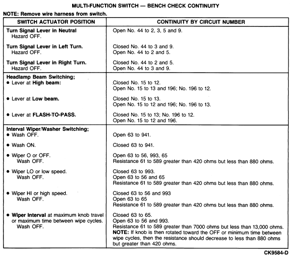 Testing the multi-function switch for electrical malfunctions can be performed using Rotunda Digital Volt Ohmmeter 007-00001 or equivalent.