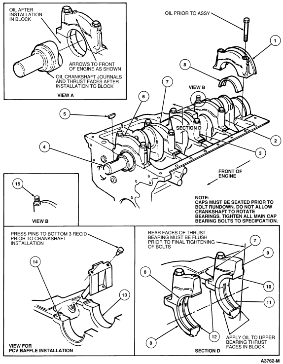 Selective fit main bearings are used in this engine. No. 3 journal is the thrust bearing.