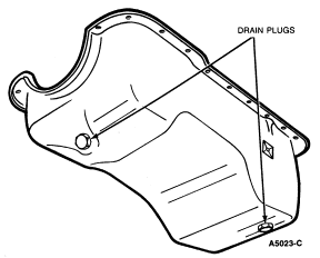 NOTE: When changing oil, both drain plugs must be removed to thoroughly drain the crankcase. One drain plug is located on the front of the oil pan and the other plug is located on the LH bottom side of the oil pan. Failing to remove both drain plugs when changing the oil can lead to an incorrect oil level reading after filling the crankcase with the specified amount of oil.