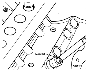 If the tappets cannot be removed from their bores due to excessive varnish, etc., it may be necessary to use a claw-type tool or a magnet to remove them. Rotate the tappet back and forth to loosen it from the gum or varnish that may have formed on the tappet.