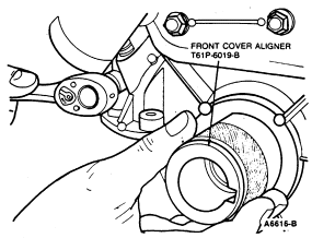 NOTE: Cover the front oil pan opening while the cover assembly is off to prevent foreign material from entering the pan.