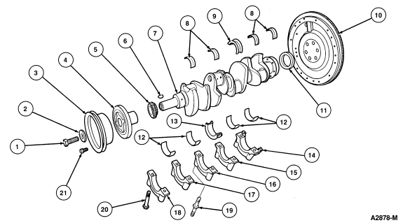 - Remove the crankshaft main bearing caps, bearings and crankshaft.