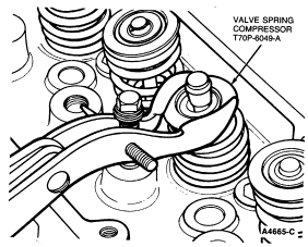 - Compress the valve springs using Valve Spring Compressor T70P-6049-A.