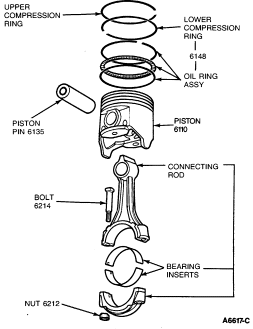 The piston, connecting rod and related parts are shown. Check the fit of a new piston in the cylinder bore before