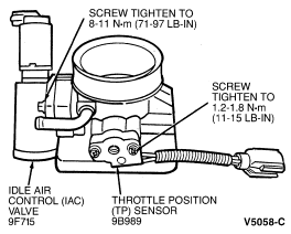Install two throttle position sensor retaining screws. Tighten to 1.2-1.8 Nm (11-15 lb-in).