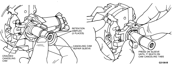 Whenever a cracked turn signal cancel cam is encountered on fixed steering columns, it is not necessary to replace the entire upper steering shaft assembly. Instead, a turn signal canceling cam service sleeve, Part No. E1AC-13B368-AA is installed as follows: