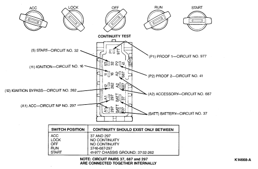Disconnect multiple connector by spreading apart the locking fingers on each end of the connector shell while pulling to disengage from the ignition switch. Test the switch continuity as described in the following illustration. Connect a self-powered test lamp or ohmmeter between the blade terminals indicated on the chart. No continuity between any blade and chassis ground should exist in any switch position except the proof Circuits 41 and 977 in the START position only.