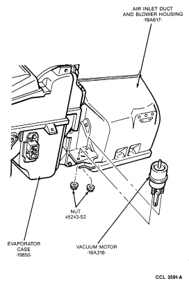 Remove spring nut retaining panel defrost door vacuum motor arm to door shaft.