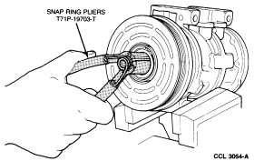 - Install seal seat retaining snap ring into nose of compressor and push snap