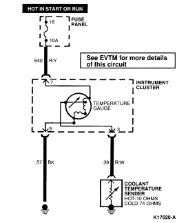 The temperature indicating system is a magnetic-type indicating system, which consists only of the sending unit located in the engine block cylinder head or intake manifold on 5.0L and a temperature gauge in the instrument cluster and system wiring. The sending unit changes resistance according to the temperature of the engine coolant, which varies the current flow through the gauge. The pointer position varies proportionally to the current flow. The sender resistance is high when the coolant temperature is low, and low when the coolant temperature is high.