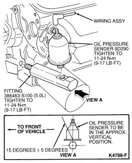 To replace the unit, disconnect the wire from the terminal. Remove the unit from the engine. Apply Pipe Sealant with Teflon® D8AZ-19554-A (ESG-M4G194-A and ESR-M18P7-A) or equivalent or conductive sealer to the threads of the new unit and install the unit. Tighten to 11-24 Nm (9-17 lb-ft). Connect the wire to the terminal and check the operation of the unit.