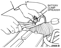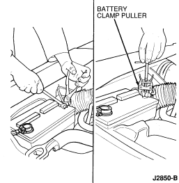 Use a clamp puller to remove a cable clamp from the battery terminal. With the jaws gripping the underside of the cable clamp, pull the clamp up by means of pressure exerted against the top of the battery terminal. Proper use of this tool avoids the damaging lateral or twisting forces that result when using a pry bar or pliers.