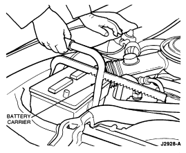 Use a suitable battery carrier for lifting and transporting the battery. The illustration shows a clamp-type carrier used to grip the sidewalls of the container just below the lip of the cover. The carrier is used on the sidewalls, rather than the endwalls, since the sidewalls have additional strength from the inner cell partitions. This is particularly important with the plastic-cased battery which has endwalls that are flexible.