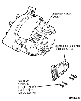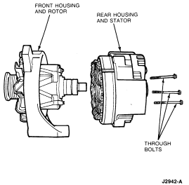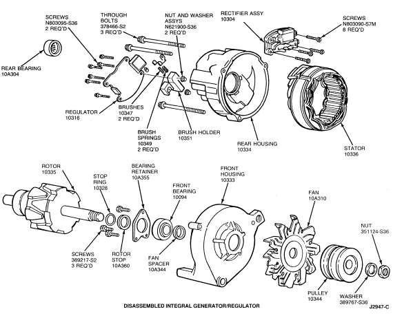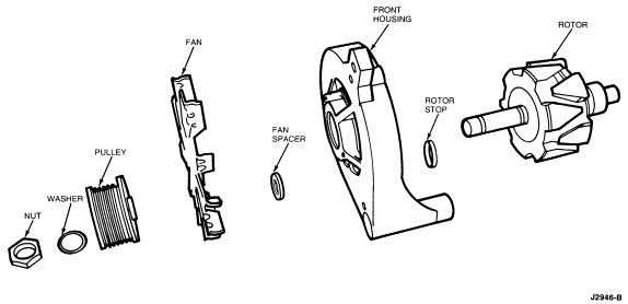 NOTE: All of the following Disassembly Steps may not be necessary to perform a particular test or service. Perform only those steps that apply. The following illustration is a disassembled view of the integral generator/regulator assembly. On generators with fan shield, remove retaining clip and then remove fan shield.