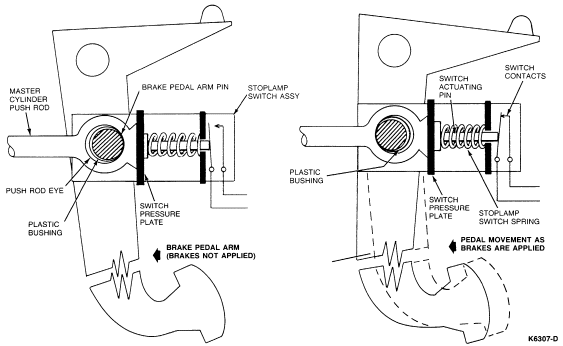 The brake pedal arm pin and plastic bushing has a designed in clearance with the eye of the master cylinder push rod. Because of this clearance, whenever the brake pedal is pushed forward, the stoplamp switch frame moves forward pulling the whole assembly forward. During that movement, the push rod flat pushes the switch pressure plate and actuating pin rearward, closing the switch contacts. This completes the circuit to the stoplamps.