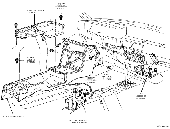 The floor console assembly attaches to these supports as well as to the instrument panel at its upper, forward end. A console top panel assembly attaches to the console at the forward end of the top panel, and through the console to the support assembly at the rear.