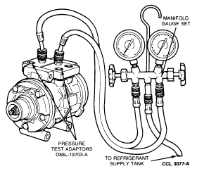 Install Pressure Test Adapters D88L-19703-A or equivalent on compressor.