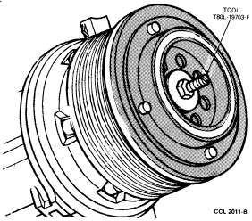 on the compressor using Pulley and Bearing Tool T80L-19703-J. Ensure pulley bearing is aligned with the compressor head.