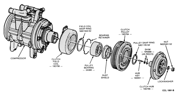 Install the pulley and bearing on the compressor. The bearing is a slip fit