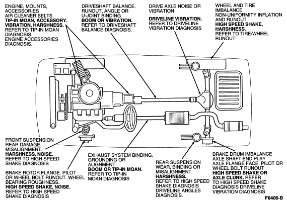 Noise, vibration and harshness (NVH in engineering shorthand) is becoming more and more important as the vehicles are becoming more sensitive to these vibrations. This section is designed to give a working knowledge of the process of diagnosing noise and vibration situations. It is divided into several sections based on the description of the condition. If the condition occurs at high speed, for instance, the most likely place to start is under High Speed Shake. The Road Test Section will tell how to sort out the conditions into categories and how to tell a vibration from a shake. It will give a few hints on quick checks to make sure that a cause is either pinpointed or eliminated.