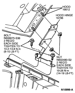 Position the hood hinge to the hood and install the two retaining screws. Tighten screws to 10.2-13.8 Nm