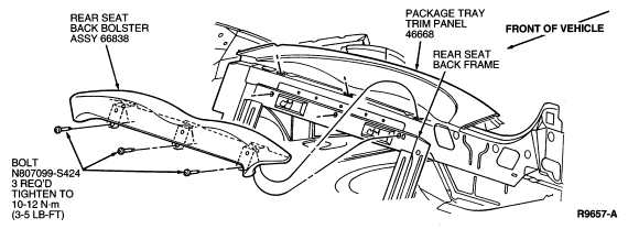 Removal of the rear seat cushion and rear seat back assembly is necessary on all models for replacement of the liftgate door trim panel (46668) . Refer to Section 01-10 for rear seat cushion and seat back removal and installation procedures. On all models it will be necessary to remove the quarter trim panel (31012) .