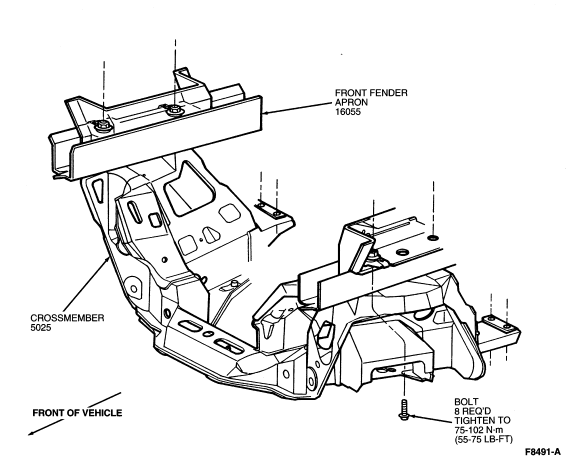 After crossmember alignment is complete, tighten eight crossmember-to-body bolts to 75-102 Nm (55-75 lb-ft). Remove adjustable jacks.