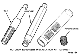 Damaged spark plug threads in the cylinder head can be serviced using Rotunda Tapersert Installation Kit 107-00901 or equivalent.