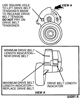 Automatic drive belt tensioners are spring loaded devices which set and maintain the drive belt tension. The drive belt does not require tension adjustment for the life of the drive belt . Automatic drive belt tensioners have belt wear indicator marks. If the drive belt length indicator mark is not above the one percent drive belt strength indicator, the drive belt is worn or an incorrect drive belt has been installed. Replace drive belt as outlined.