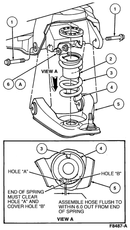 NOTE: Ensure the spring pigtail is positioned between the two holes in the front suspension lower arm spring pocket.