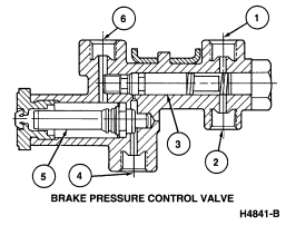 The brake pressure control valve (2B091) assembly contains a proportioning valve and a shuttle valve in an aluminum body.