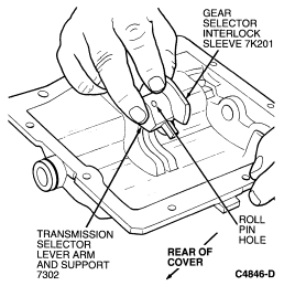 NOTE: The narrow side of the C-shaped gear selector interlock sleeve has to be positioned in the case cover slot. The control selector arm roll pin hole has to be toward the rear of the cover.