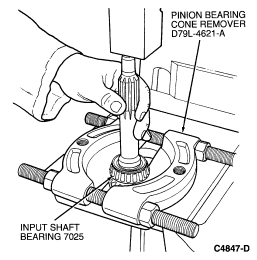 Using a press and Pinion Bearing Cone Remover D79L-4621-A or equivalent,