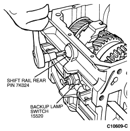 NOTE: Before installing the shift rail rear pin (7K024) , ensure the reverse gear shift rail ball stud is fully engaged with the reverse gearshift lever .
