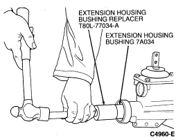 Drive a new extension housing bushing (7A034) into extension housing (7A039) with Extension Housing Bushing Replacer T80L-77034-A.
