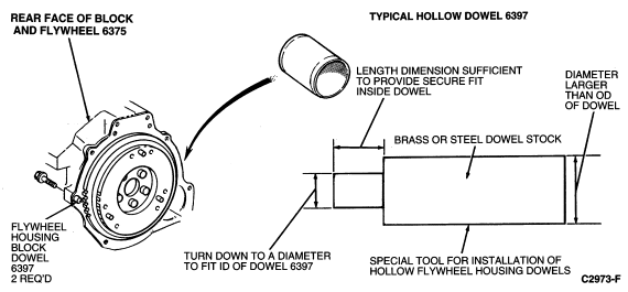Flywheel housing to block dowels (6397) can be removed by using a drift pin where the flywheel housing to block dowel is installed in a drilled hole, and locking-type pliers where the flywheel housing to block dowel is installed in a blind hole. They should be pulled or driven from their seat, taking care not to damage surface area around flywheel housing to block dowel .