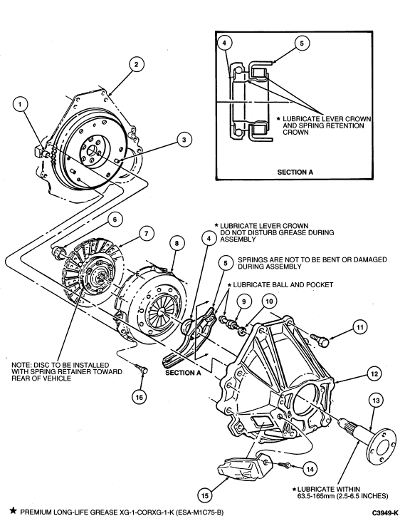Fill grease groove of clutch release hub and bearing with same grease. Clean all excess grease from inside bore of the clutch release hub and bearing . Otherwise, excess grease will be forced onto spline by transmission main drive gear bearing retainer , and will contaminate clutch disc .